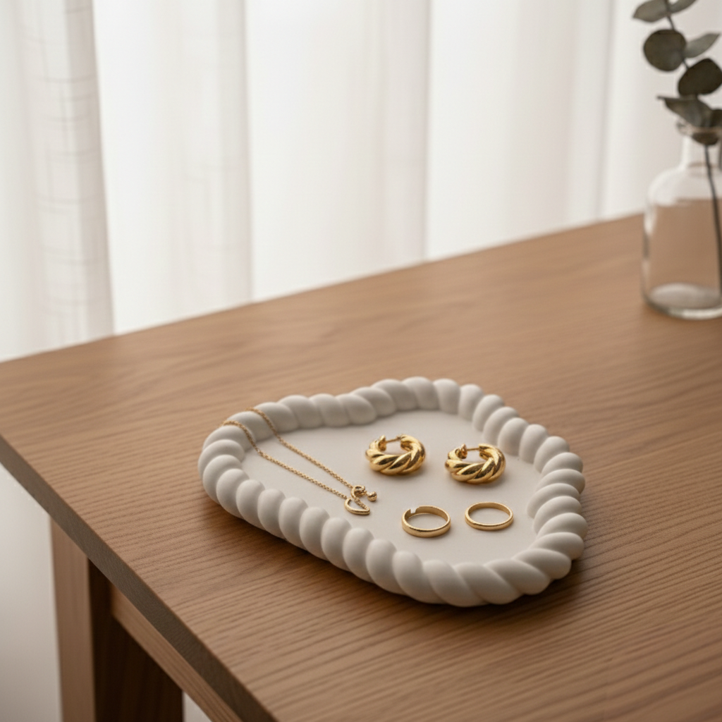 Inspirată de formele libere ale naturii, această tăviță aduce un plus de textură și originalitate decorului tău. Marginea sa împletită, cu un aspect "puffy", încadrează perfect orice obiect, de la bijuterii fine la lumânări parfumate.