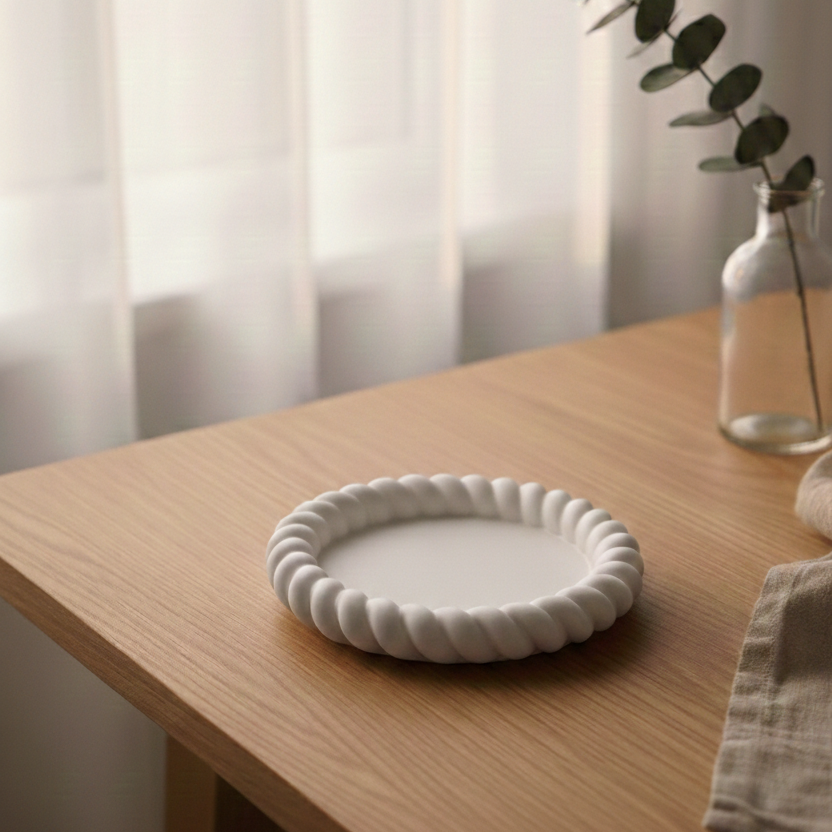 Textură împletită: Marginea reliefată, cu aspect de sfoară răsucită, adaugă profunzime și un caracter sculptural deosebit.