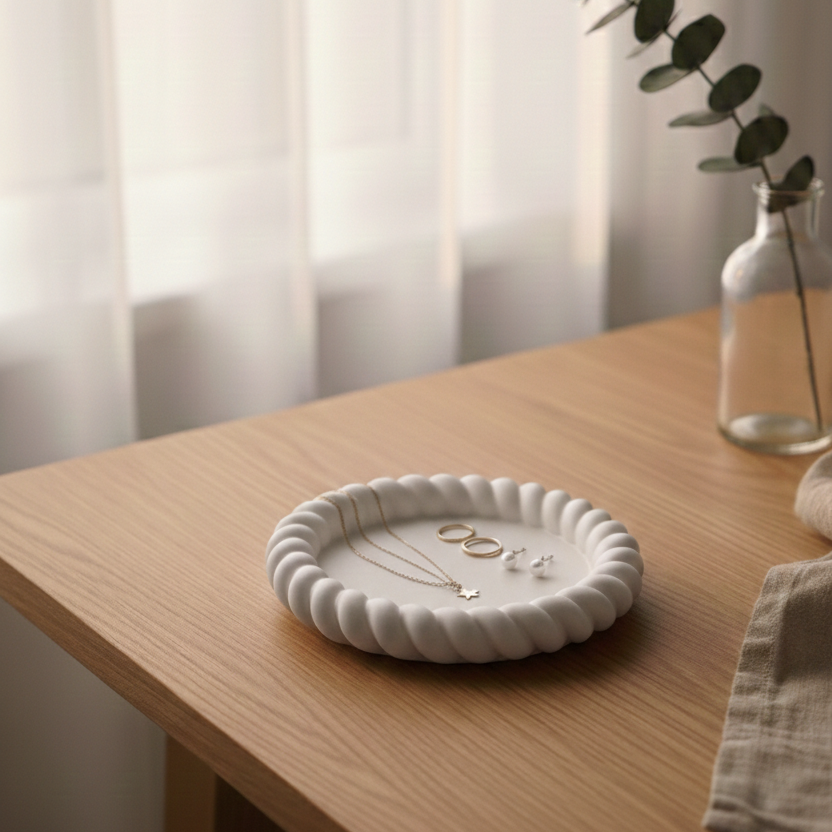 Adaugă o notă de rafinament organic mesei tale de toaletă sau noptierei cu tăvița rotundă „Luna Piena”. Designul său cu bordură spiralată și finisajul mat transformă un obiect simplu într-o mică operă de artă decorativă.
